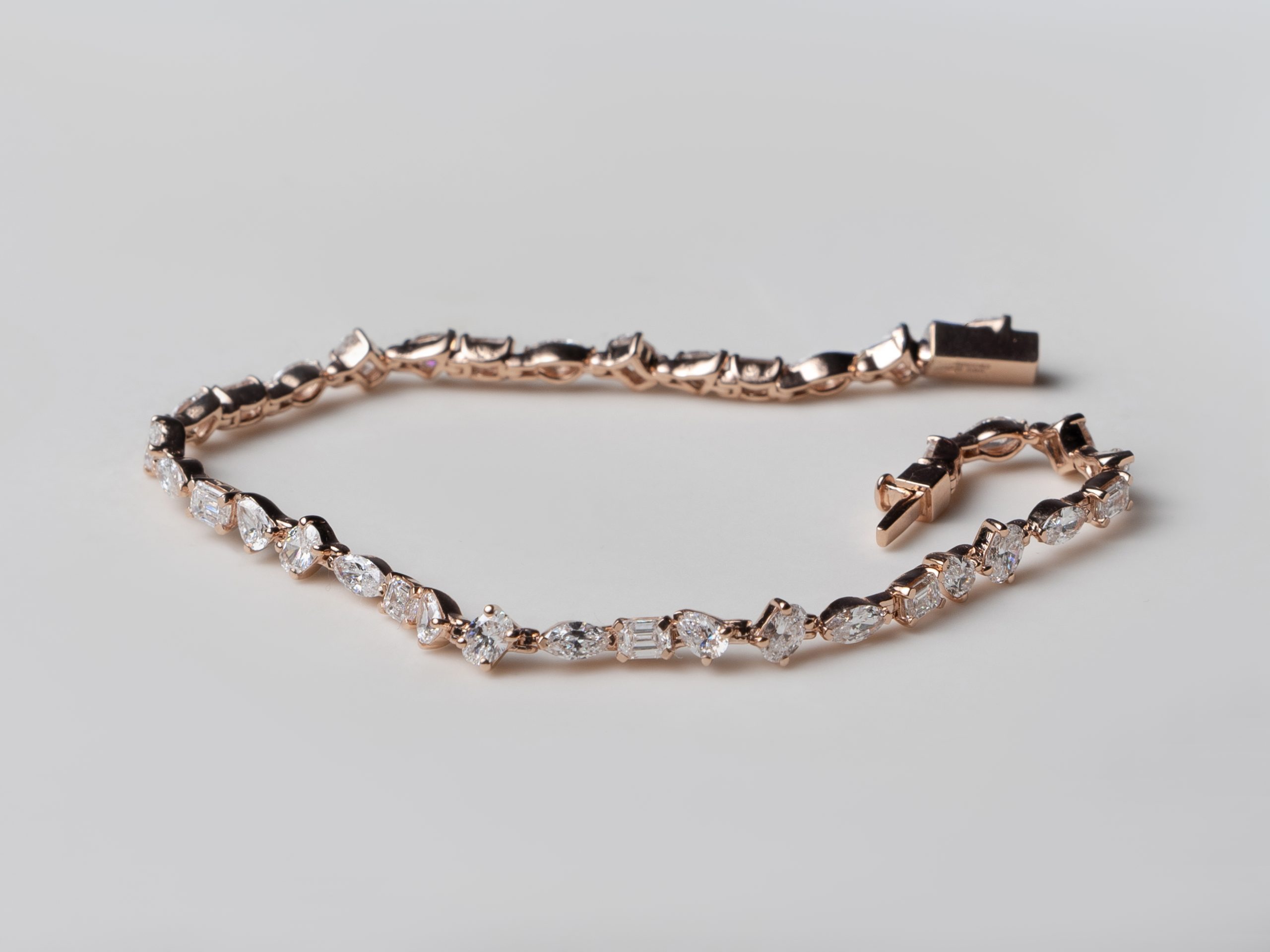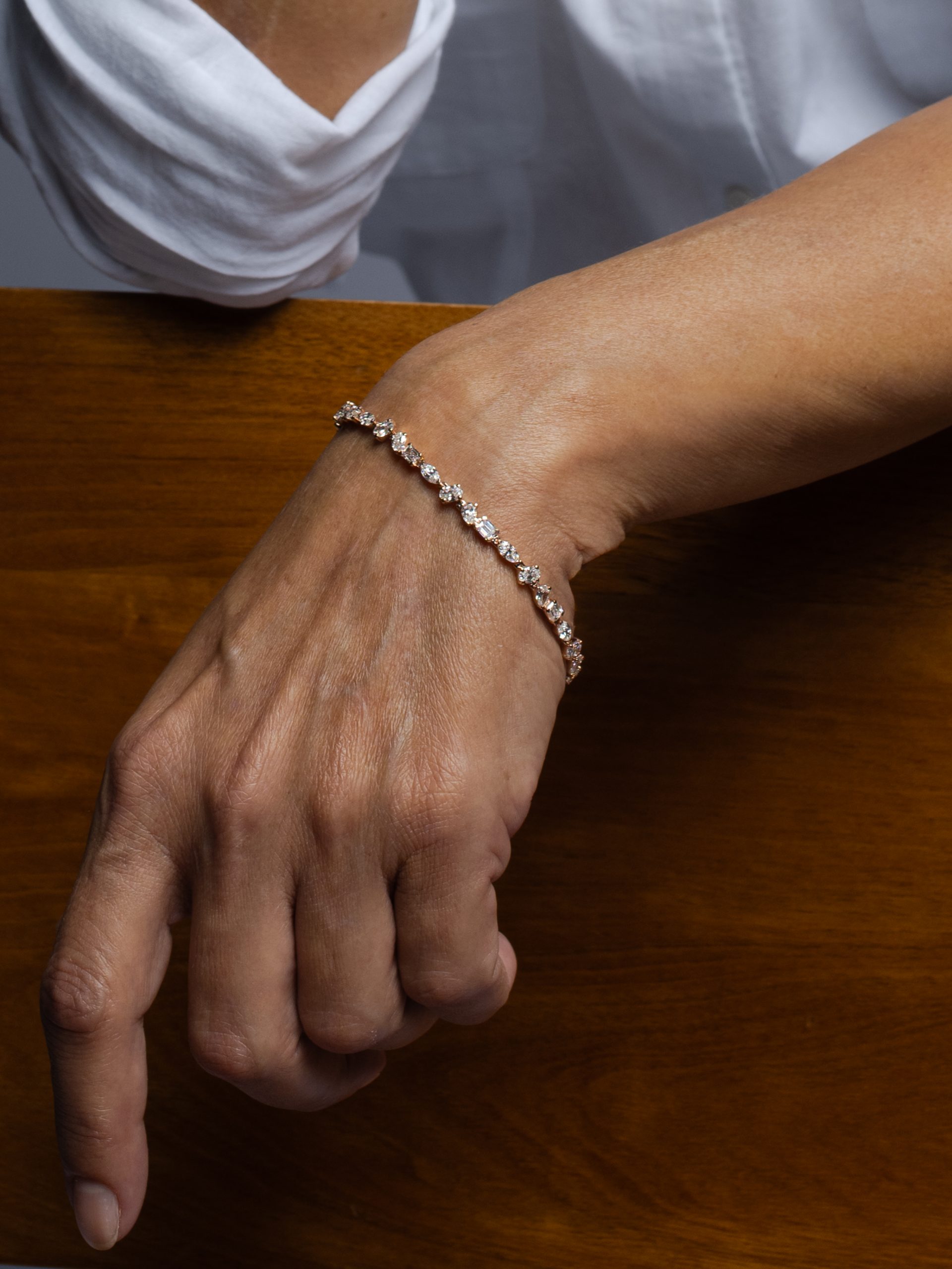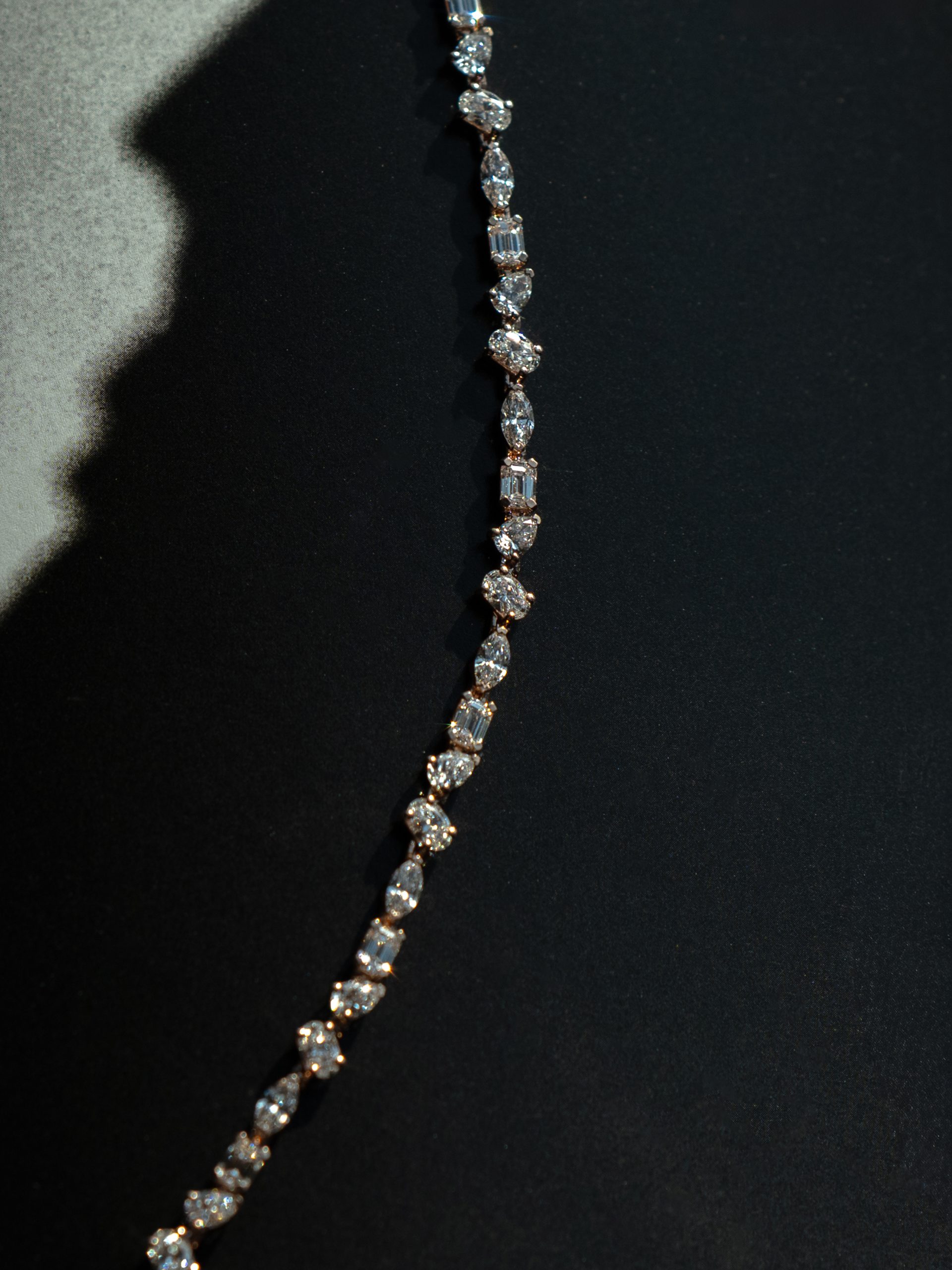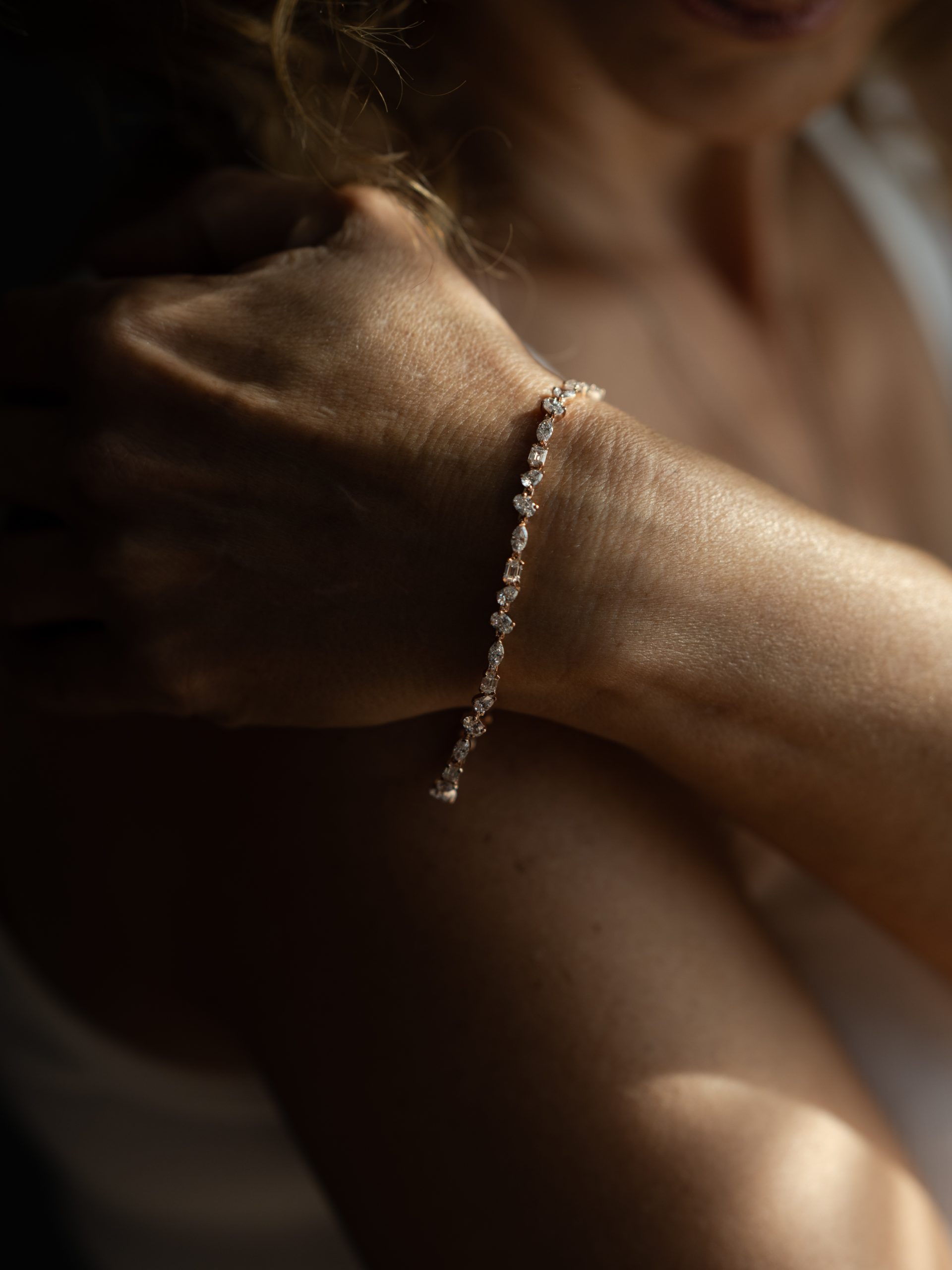 Meet Allegra — a refined interpretation of the classic tennis bracelet, designed to make everyday moments glow. Crafted in soft 14K rose gold, this piece flows effortlessly with a sequence of lab-grown diamonds in a graceful mix of marquise, oval, emerald, and round cuts, offering a dynamic interplay of brilliance and form.