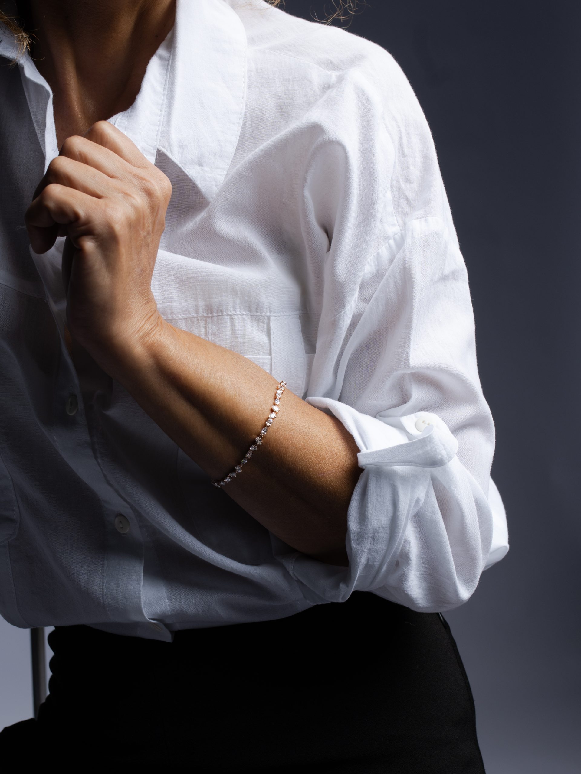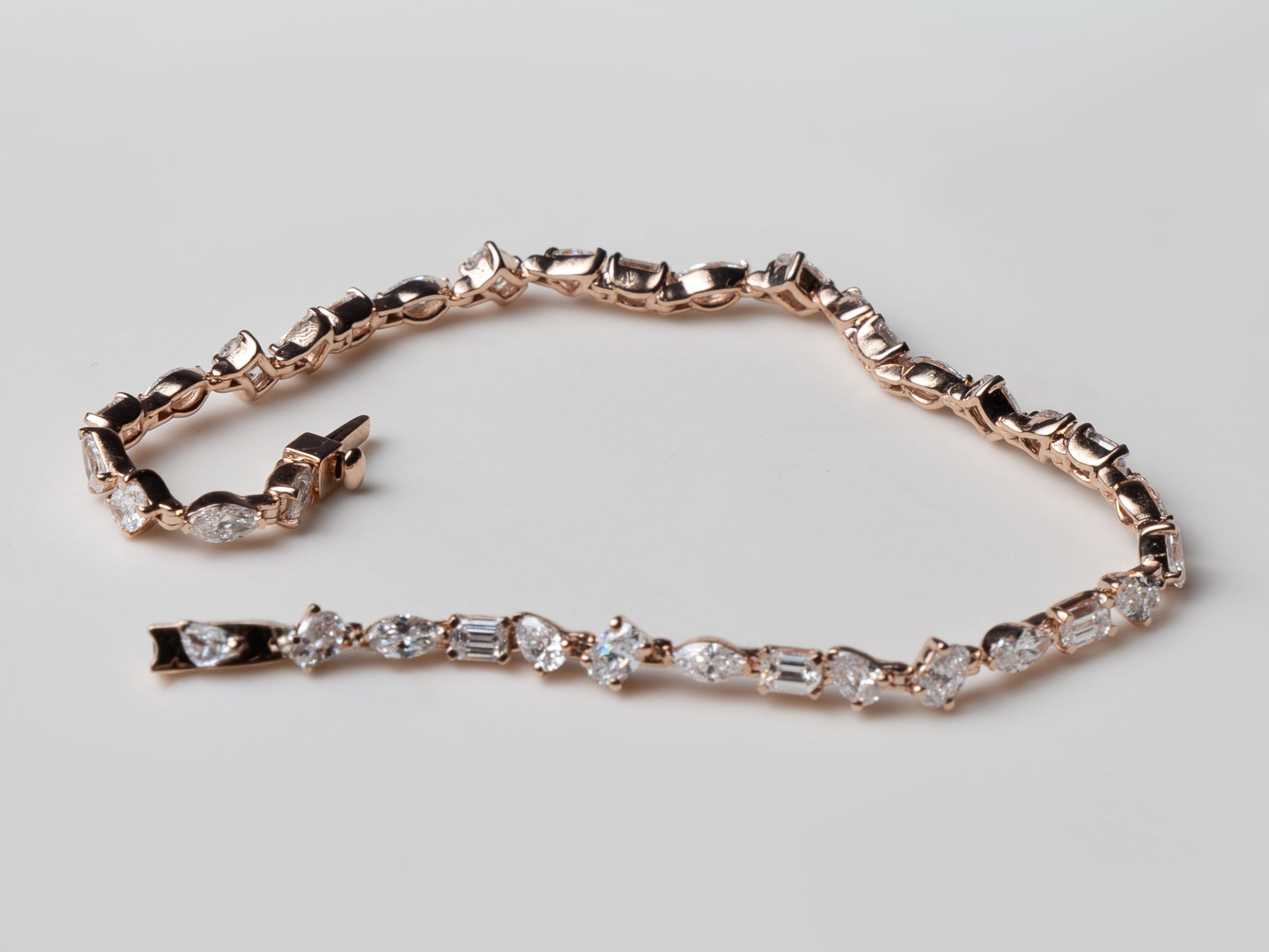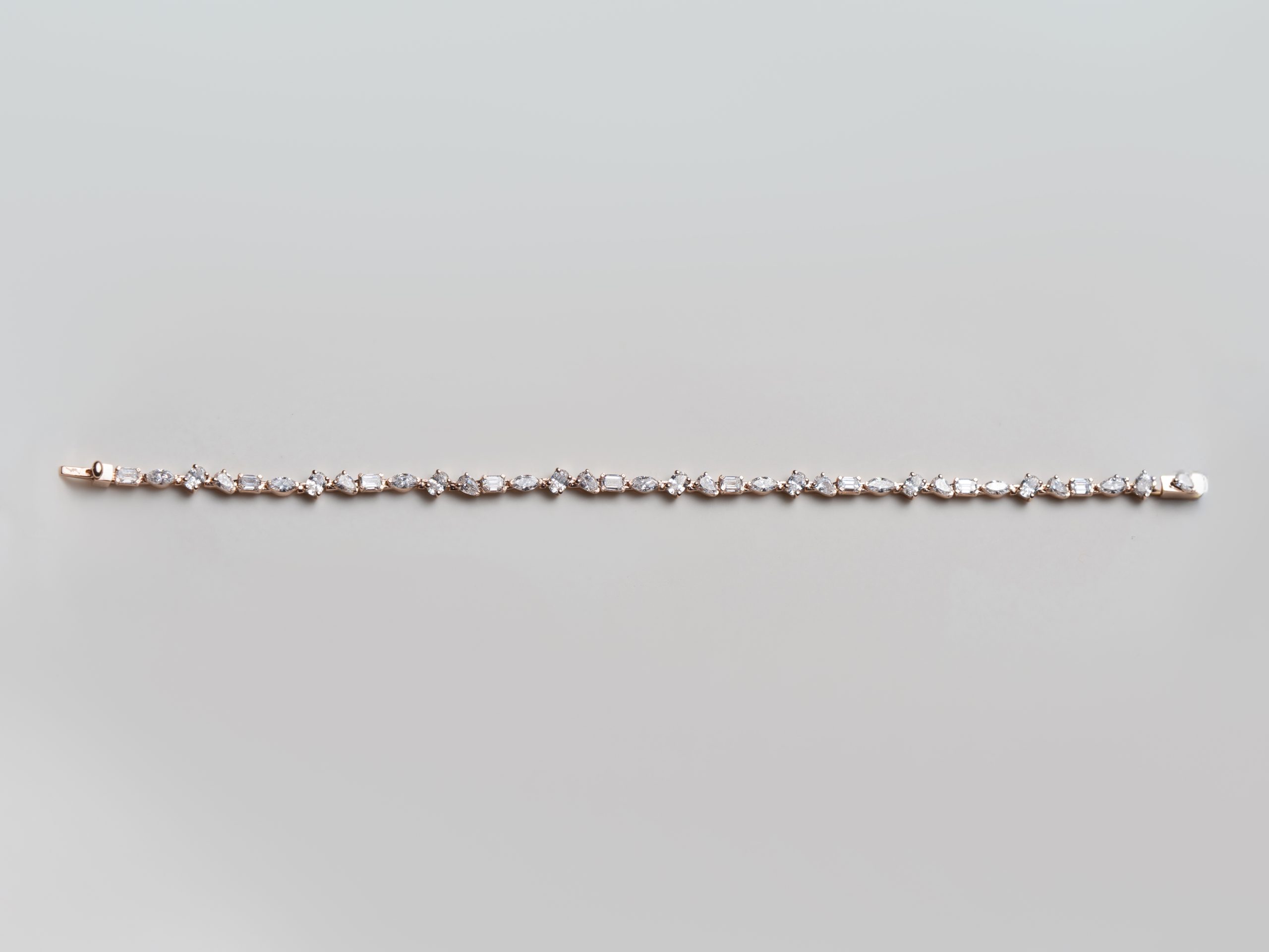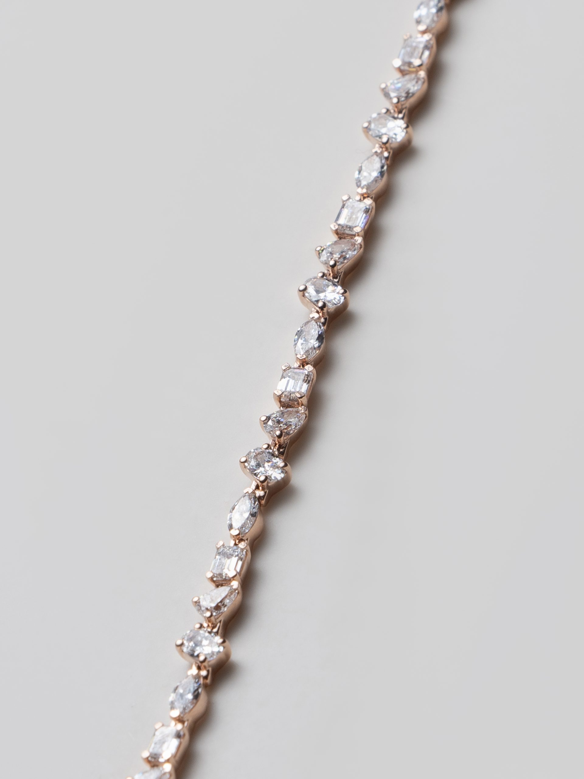 Meet Allegra — a refined interpretation of the classic tennis bracelet, designed to make everyday moments glow. Crafted in soft 14K rose gold, this piece flows effortlessly with a sequence of lab-grown diamonds in a graceful mix of marquise, oval, emerald, and round cuts, offering a dynamic interplay of brilliance and form.