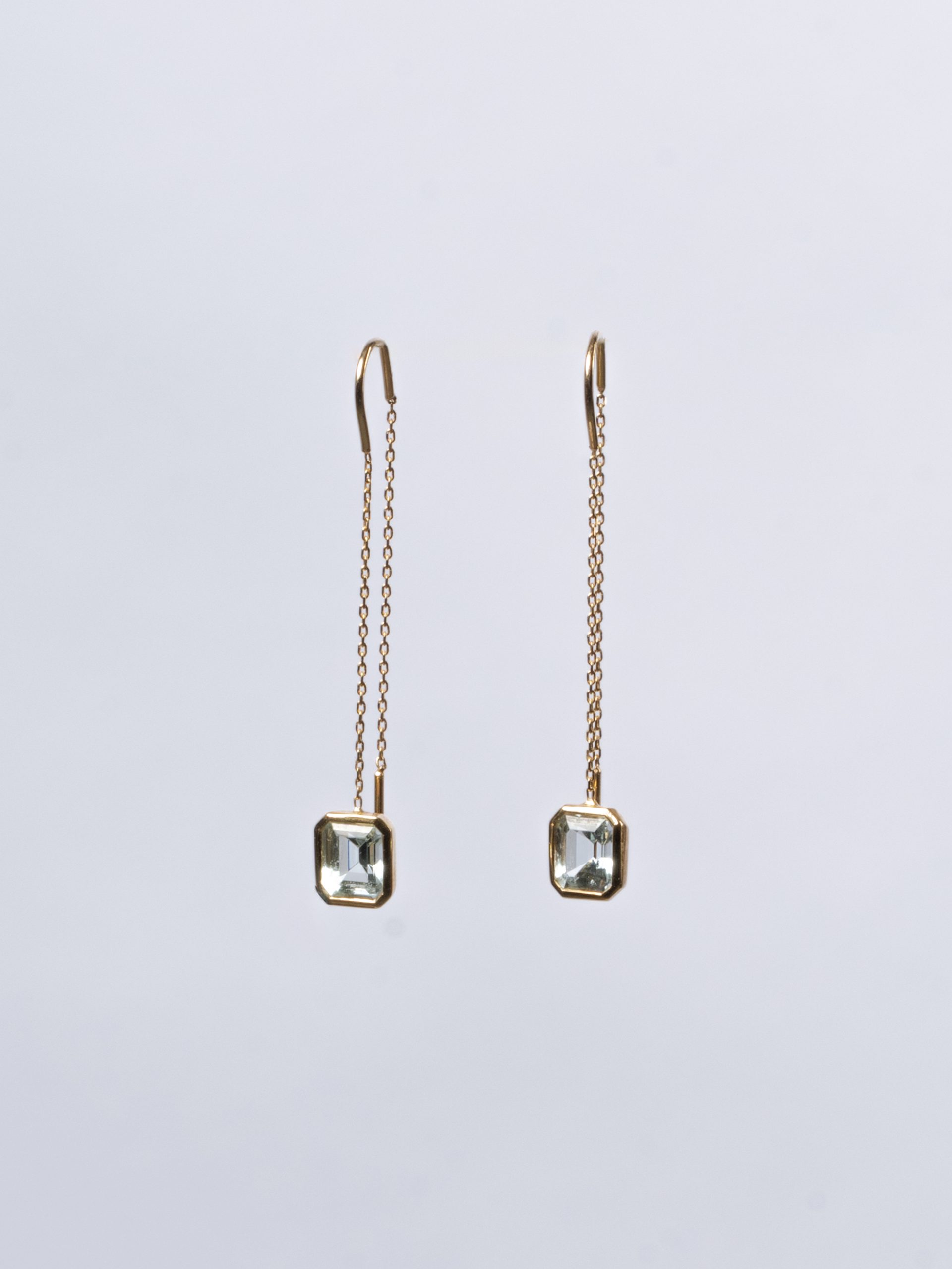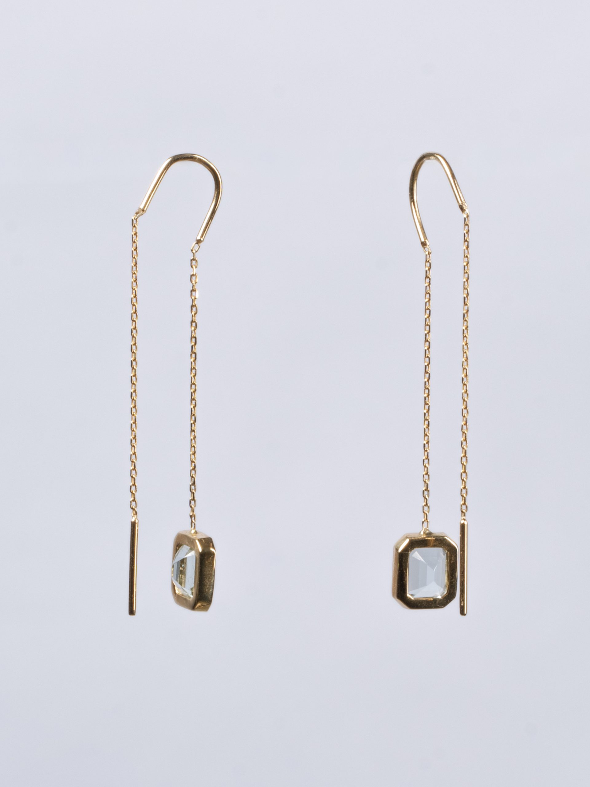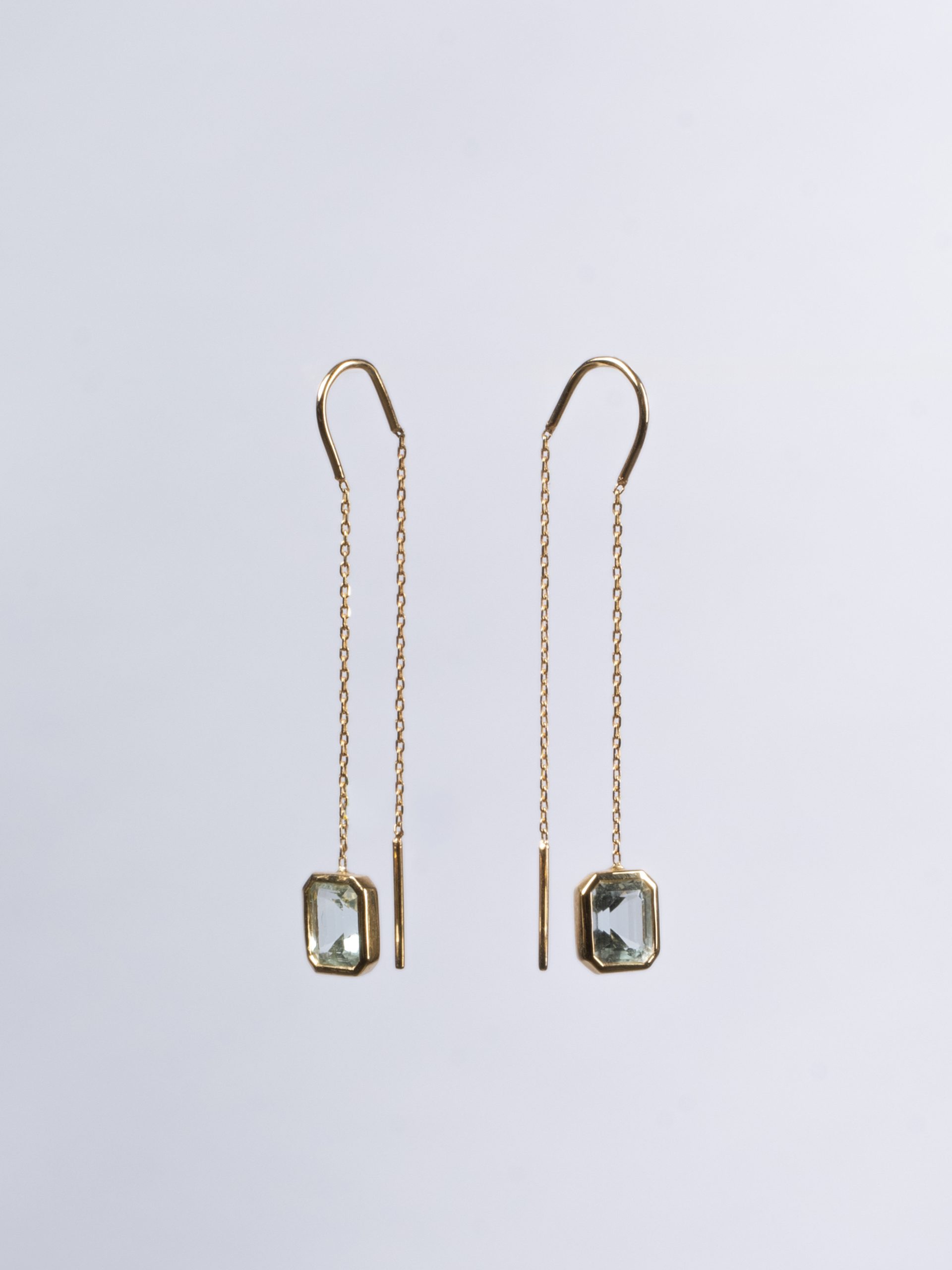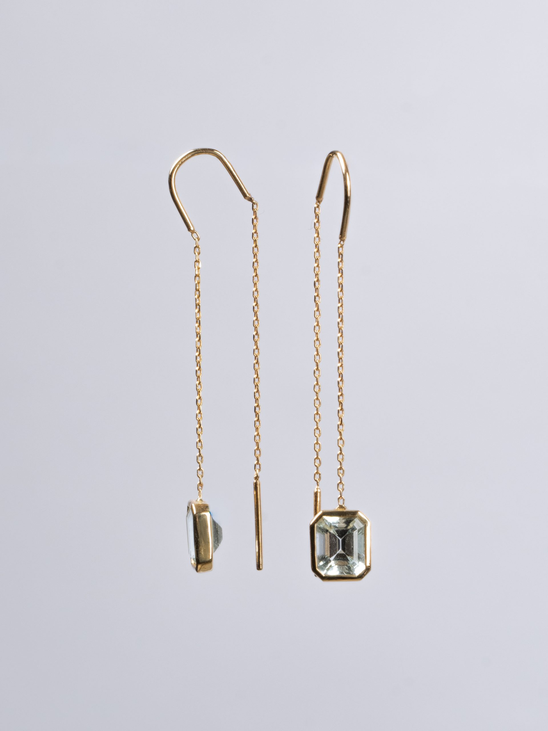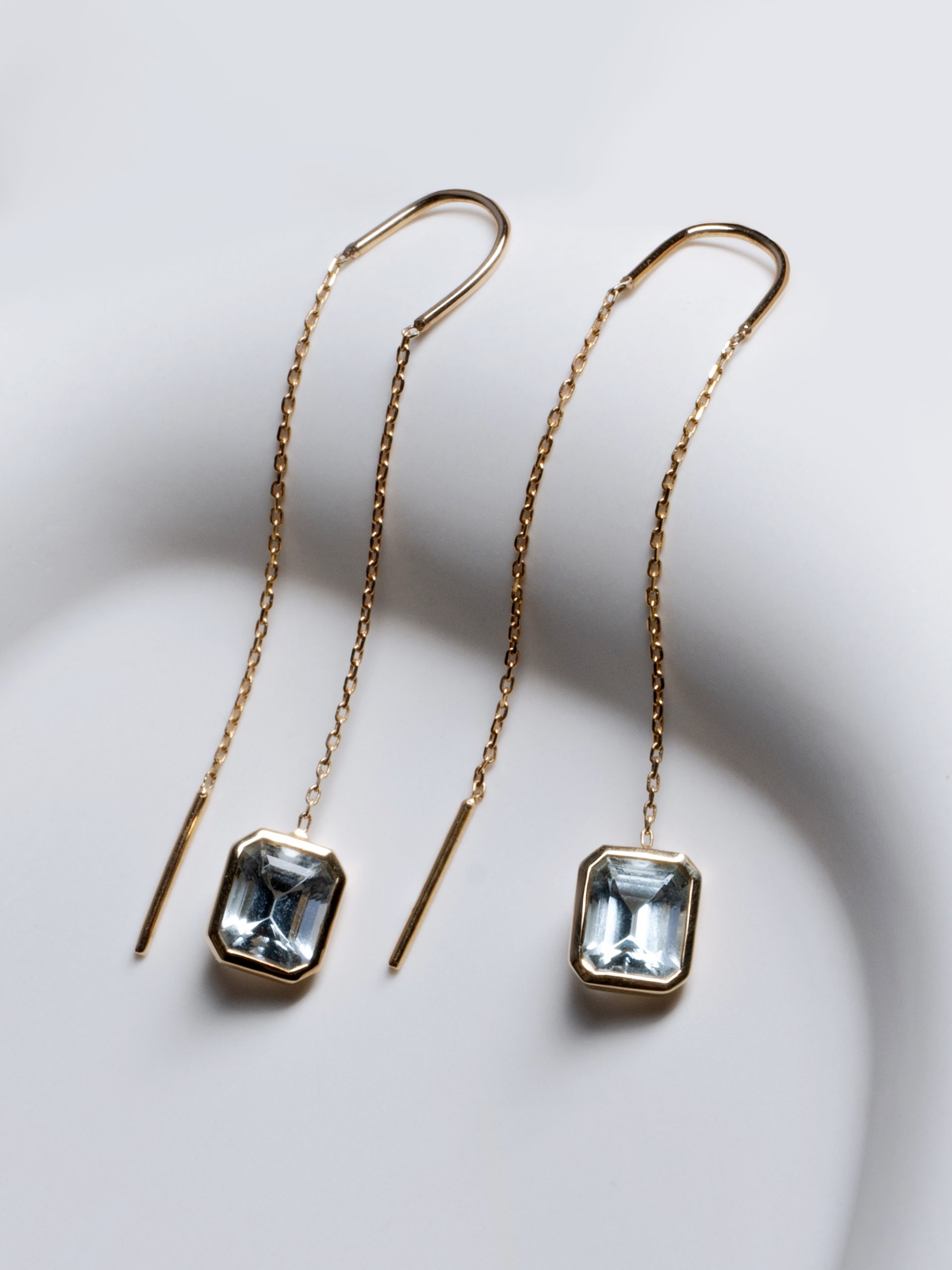 Each threader suspends a refined emerald-cut aquamarine in a minimal bezel of 18K yellow gold, catching movement like the quietest ripple.