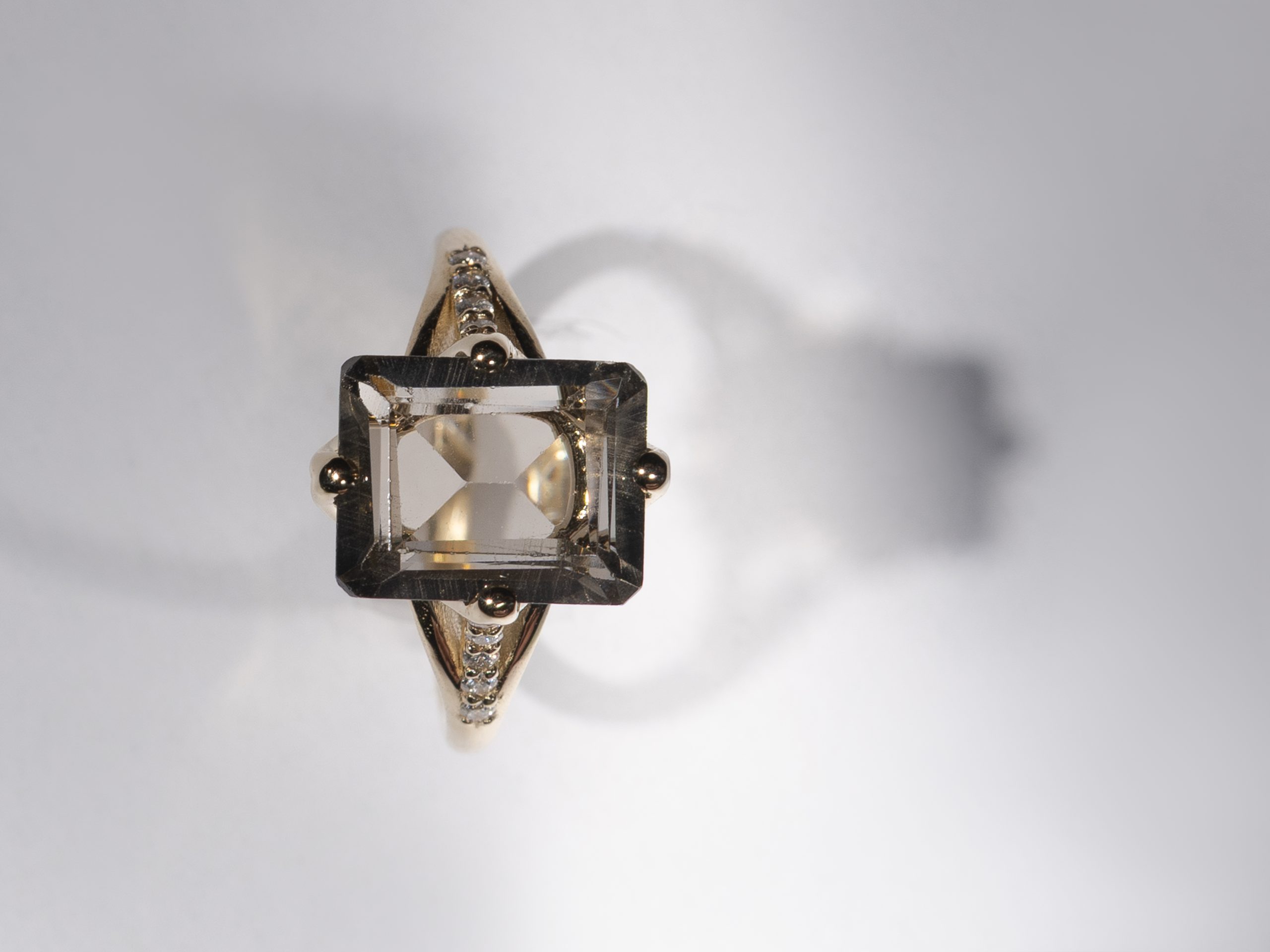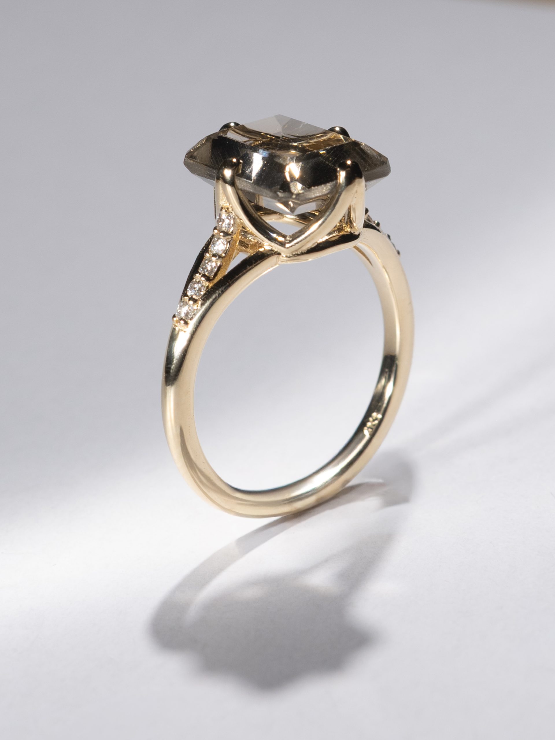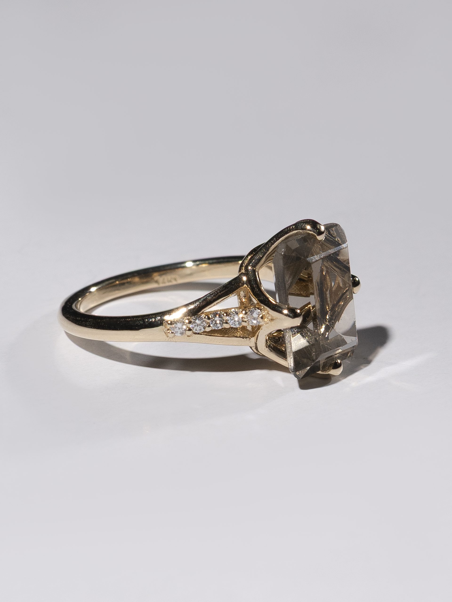 This 18K yellow gold ring features a geometric smoky quartz center stone in a modern open-prong setting, flanked by lab-grown diamonds along the shoulders. A balanced mix of mystery and minimalism, perfect for the ones who like their classics with an edge.