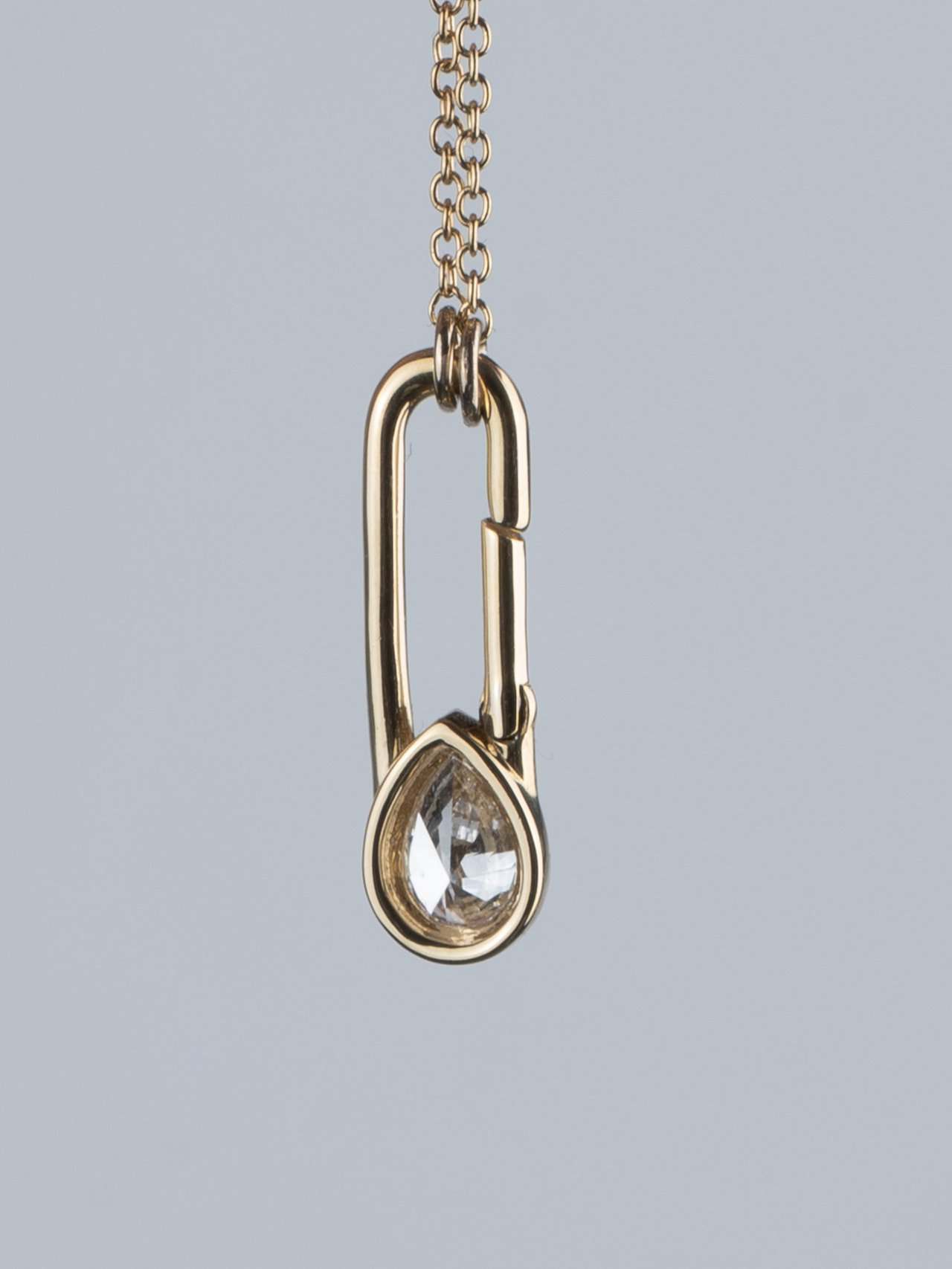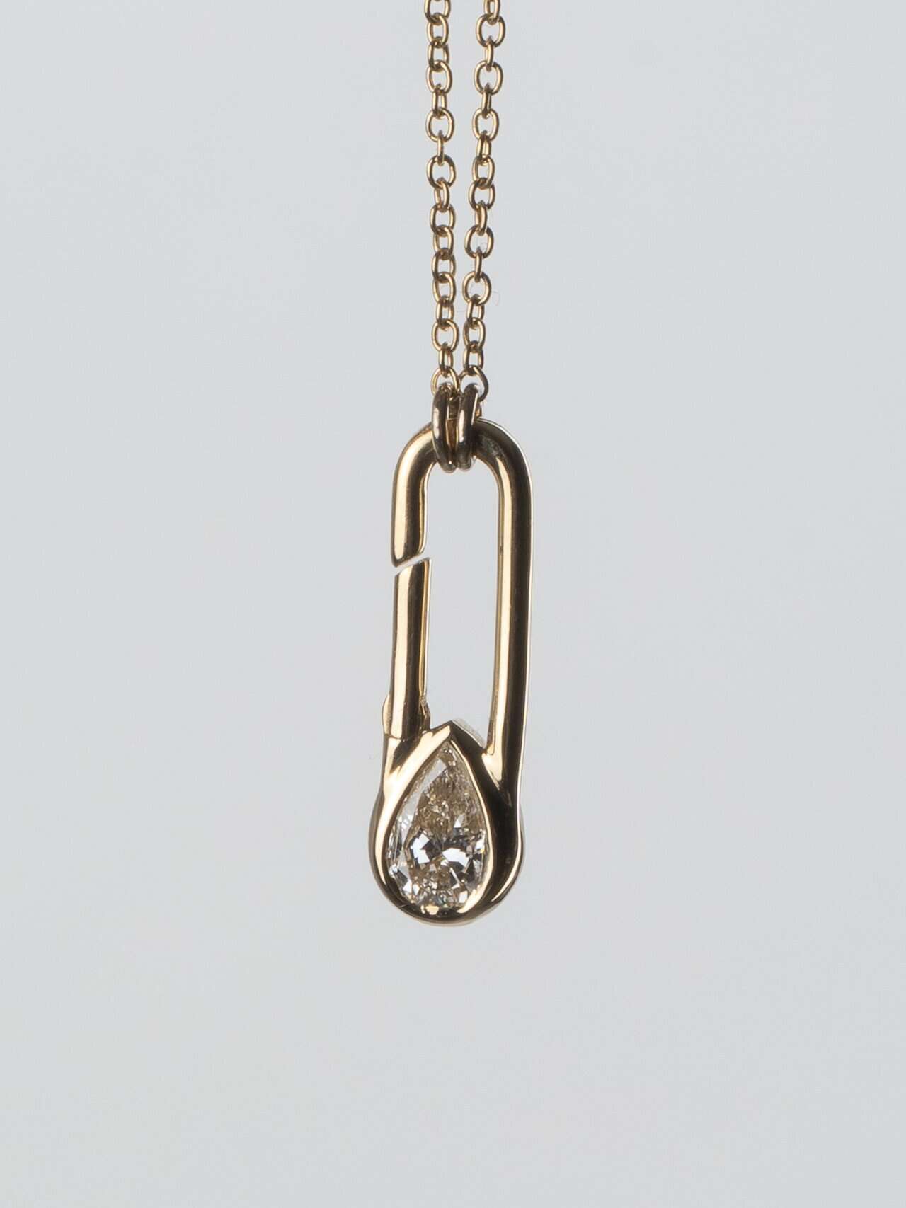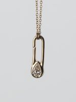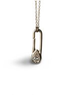 The Safety Glam Pendant transforms the iconic safety pin into a statement of modern luxury, featuring a 1-carat pear-cut diamond set in 18K Gold. Complete with a matching gold chain, it’s bold, elegant and effortlessly chic.