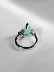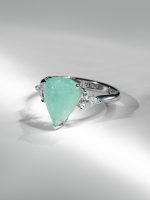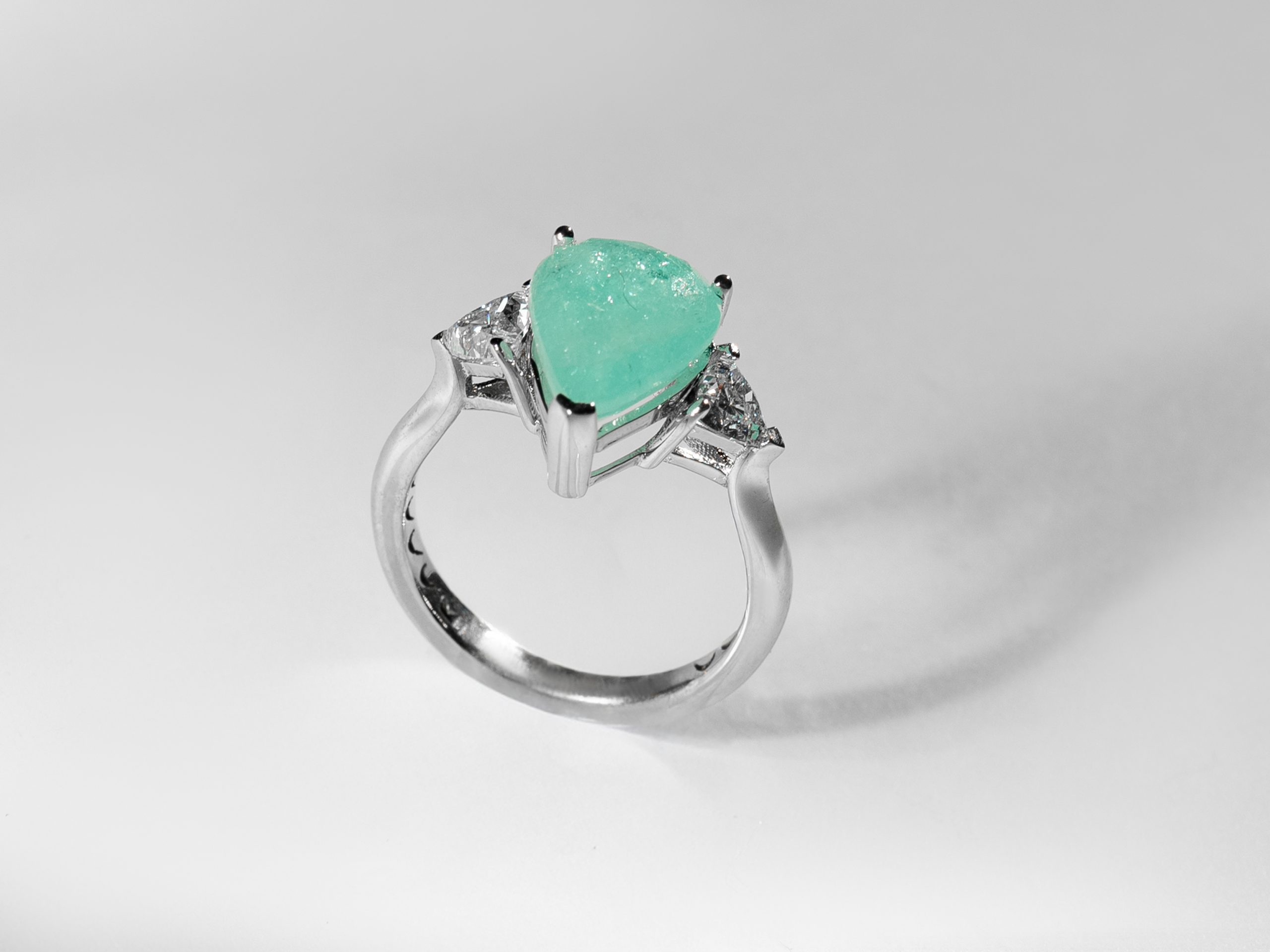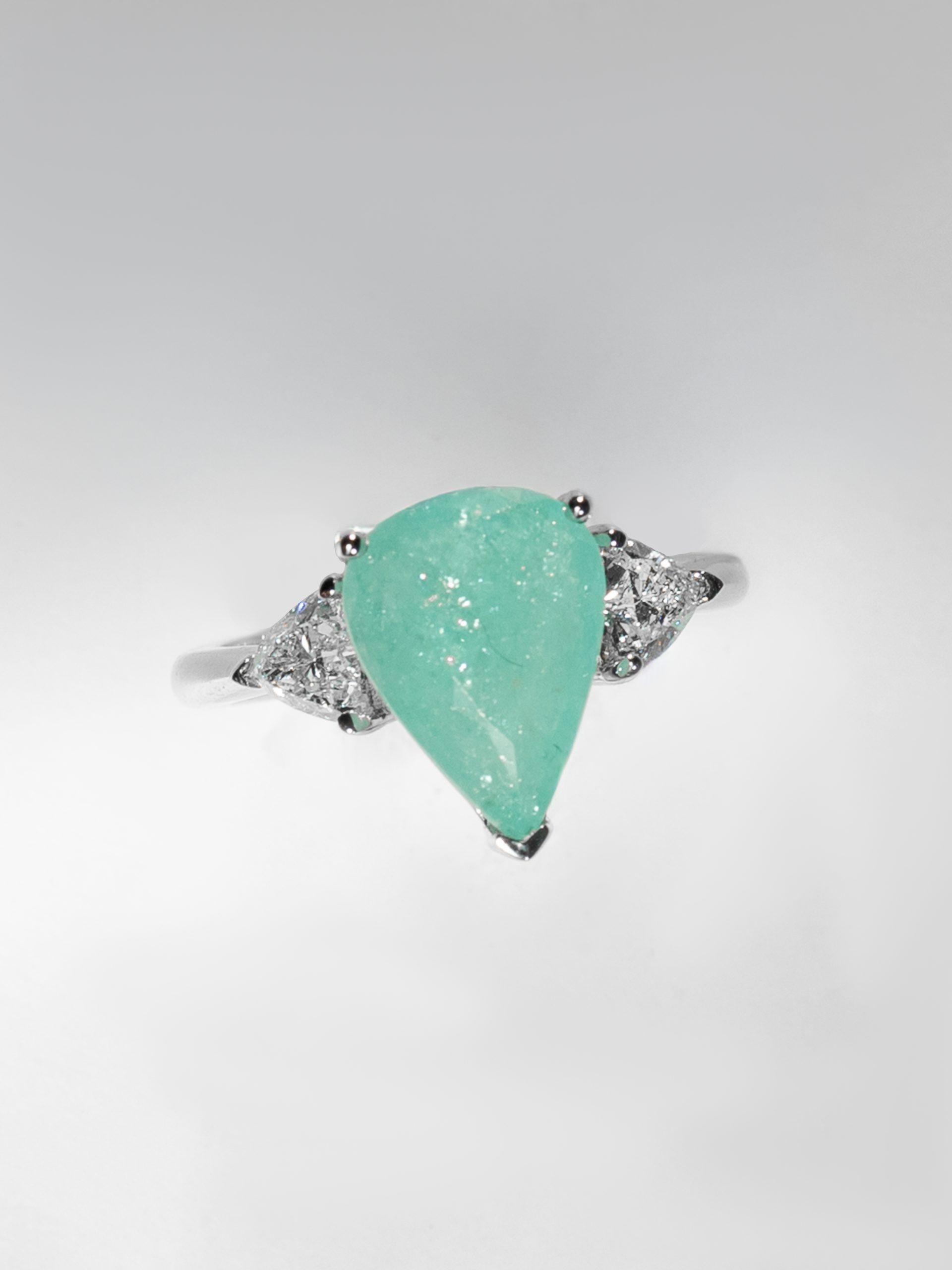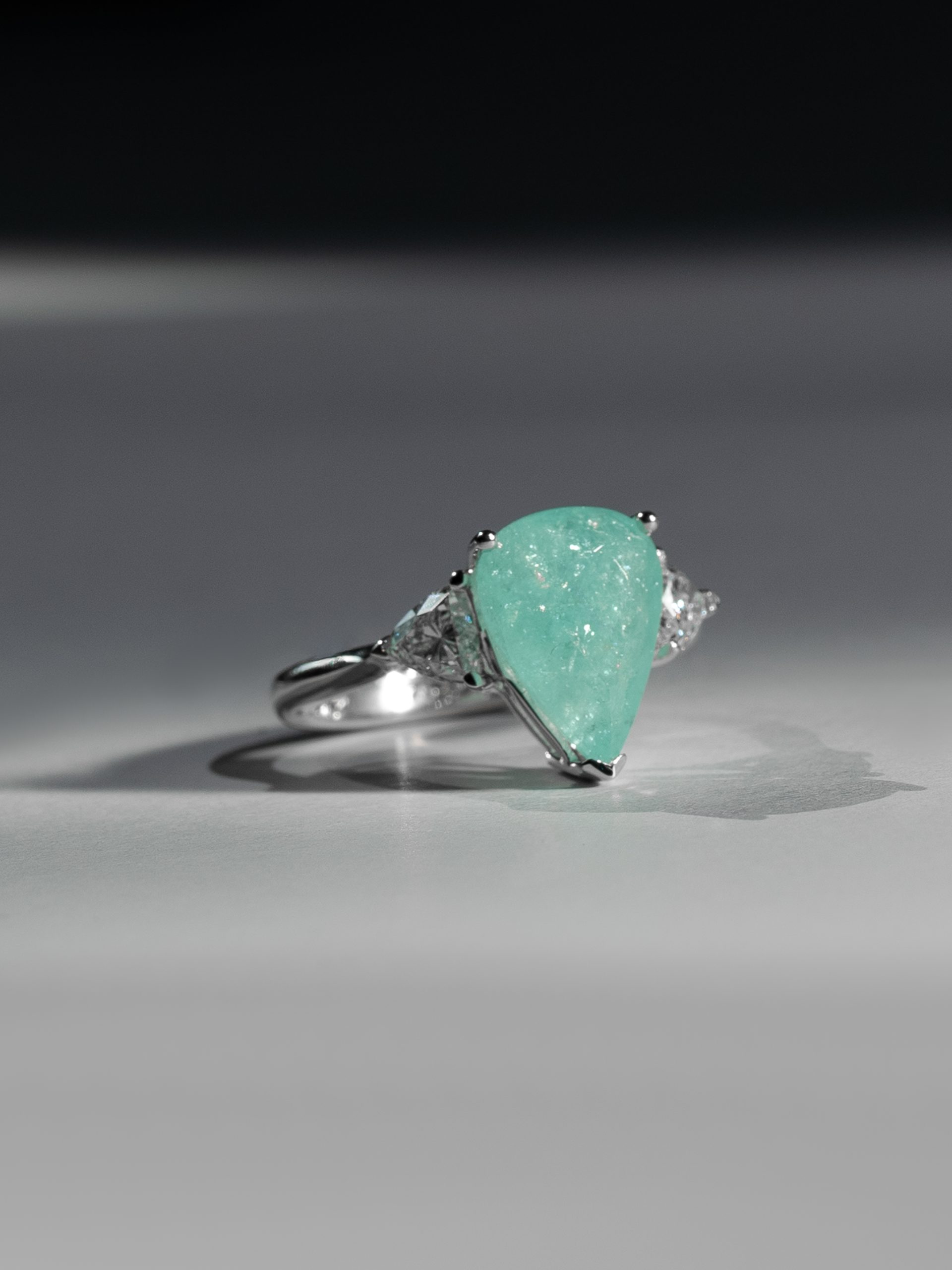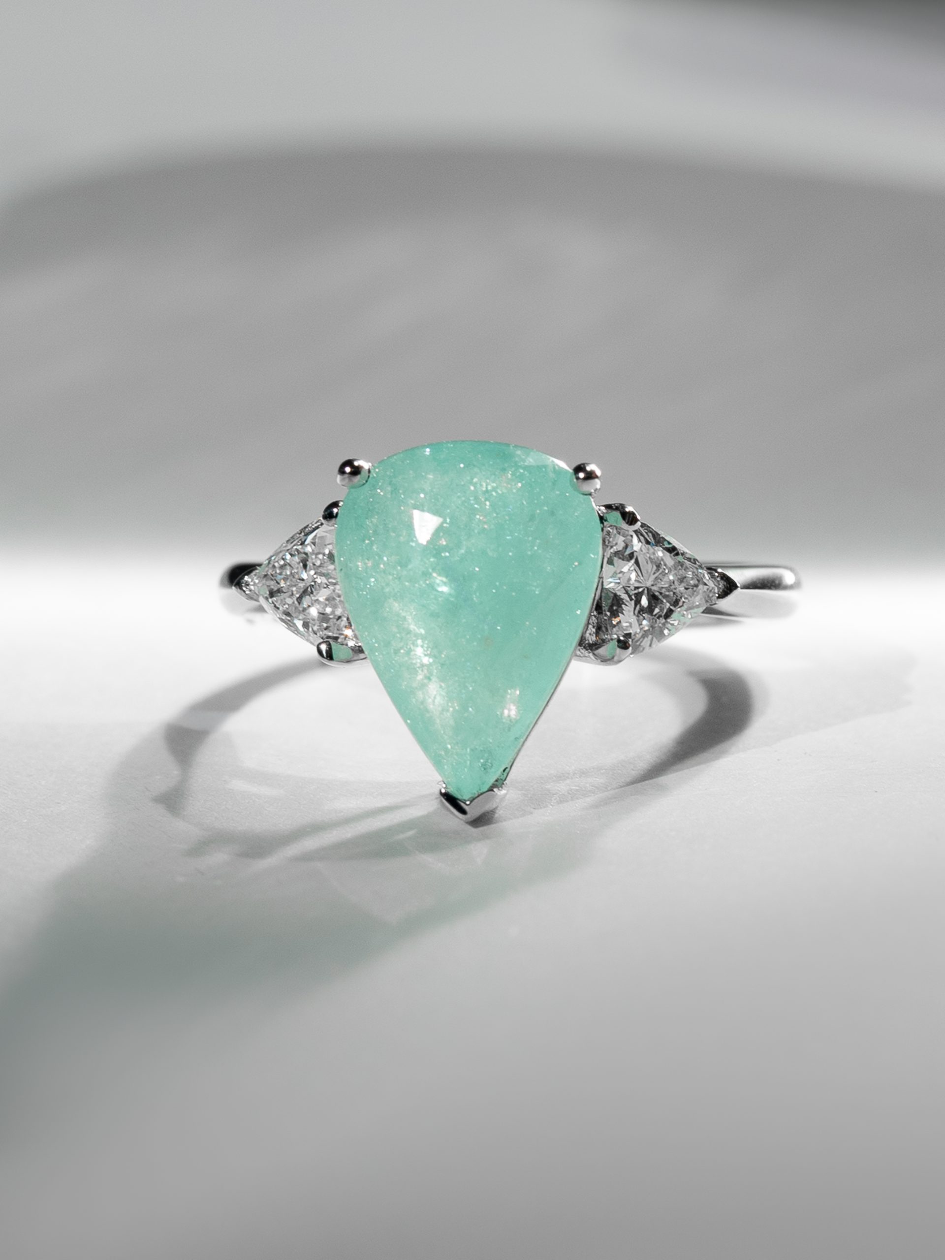 The Sirena Ring is designed for those who appreciate both classic romance and contemporary refinement. The centerpiece is a Natural Praiba Tourmaline 3.74 carats , chosen for its exceptional color and pear shape. Delicate side trillion diamonds emphasize the beauty of main stone, brilliance, while the slim 18K white gold band offers a sleek, comfortable fit.