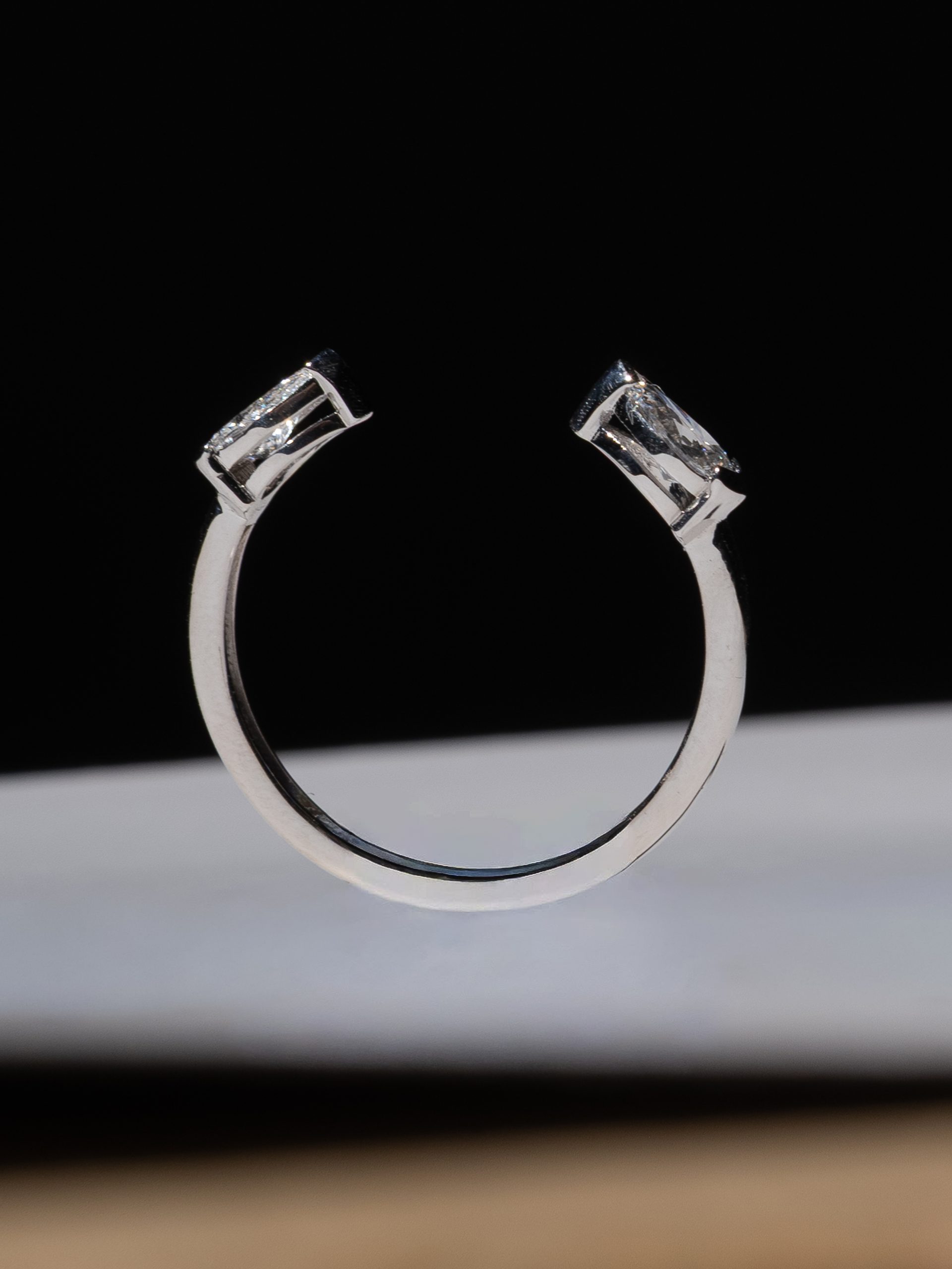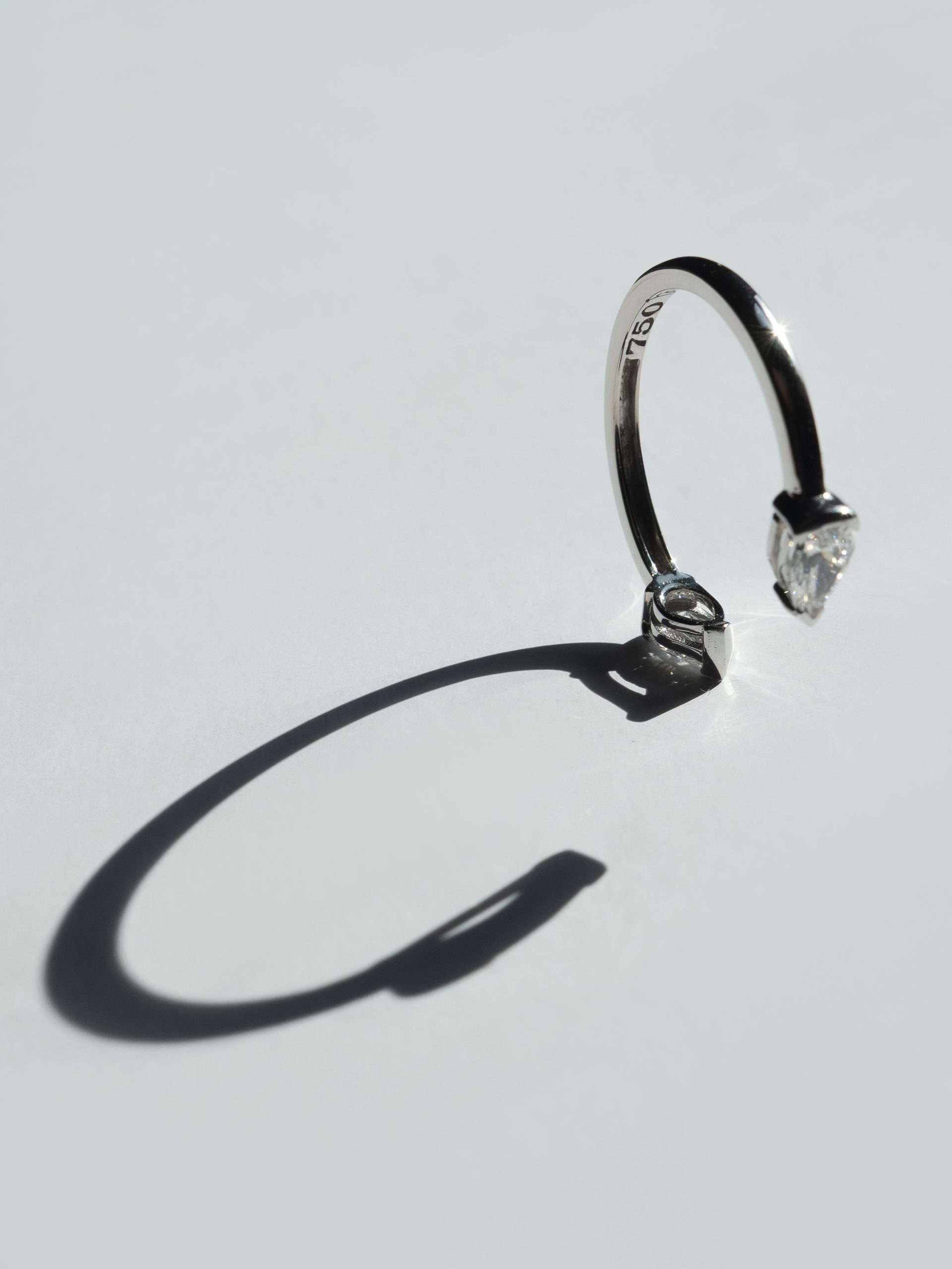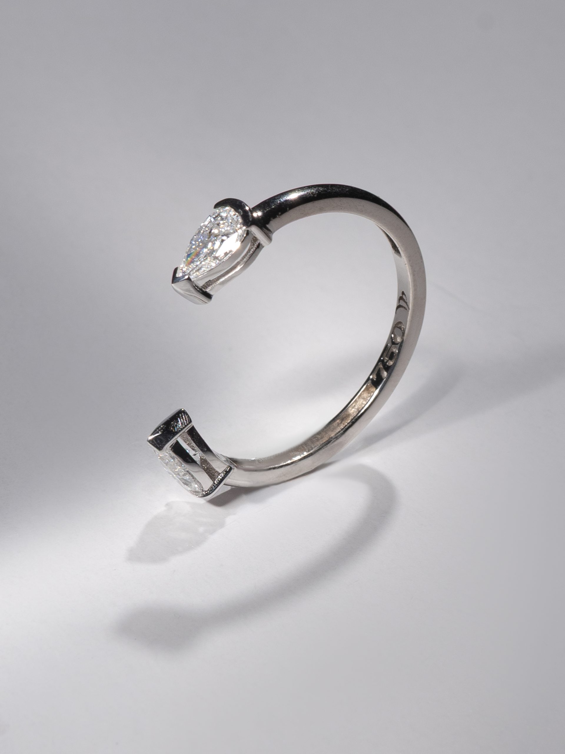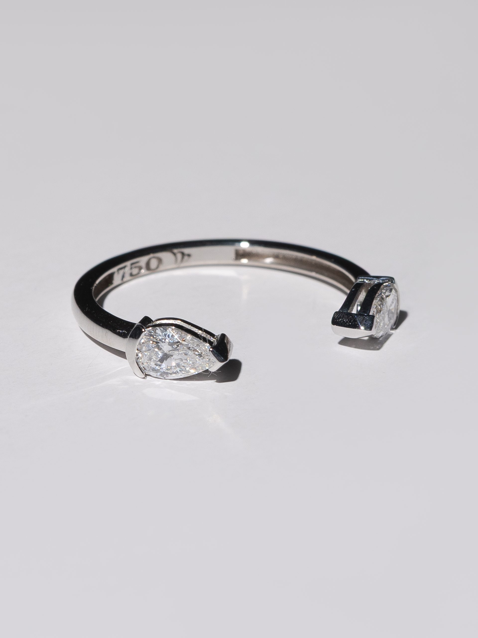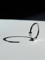 The Twin Pear Ring is a sculptural piece handcrafted from 18K white gold, featuring two sparkling pear-cut diamonds — each weighing 0.5 carats. The open design creates a modern silhouette, perfect for stacking or wearing solo as a bold yet delicate statement. Whether worn as a symbol of duality, connection, or pure elegance, this ring speaks volumes in minimalist form.